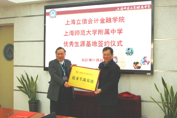 校党委副书记、副校长王军华和上海师范大学附属中校长严一平共同为“优质生源基地”揭牌。我校招生与就业办公室主任解丹阳与上海师范大学附属中学副校长汤晓春共同签署两校“优质生源基地”建设协议书。