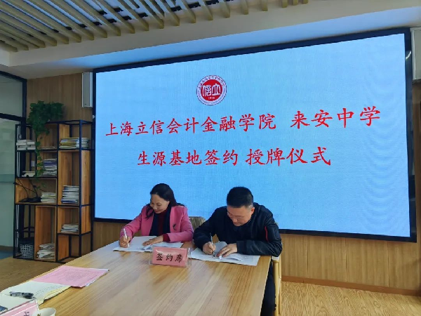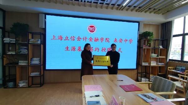 随后招生与就业处副处长肖远志、来安中学校长刘玉华代表双方学校签署“优质生源基地”建设协议书。学院党委副书记、副院长王军华向来安中学授“上海立信会计金融学院优质生源基地”牌匾。